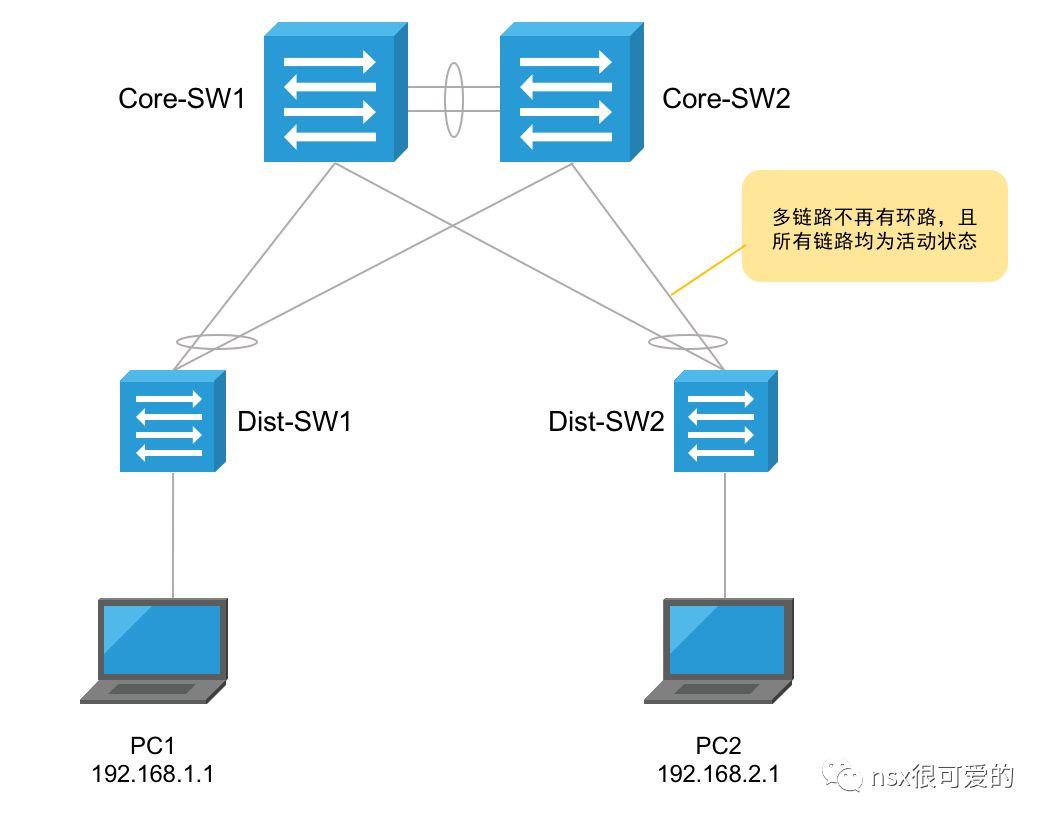 或者将用户的网关放置在核心层,汇聚层和接入层只做二层网络透传: